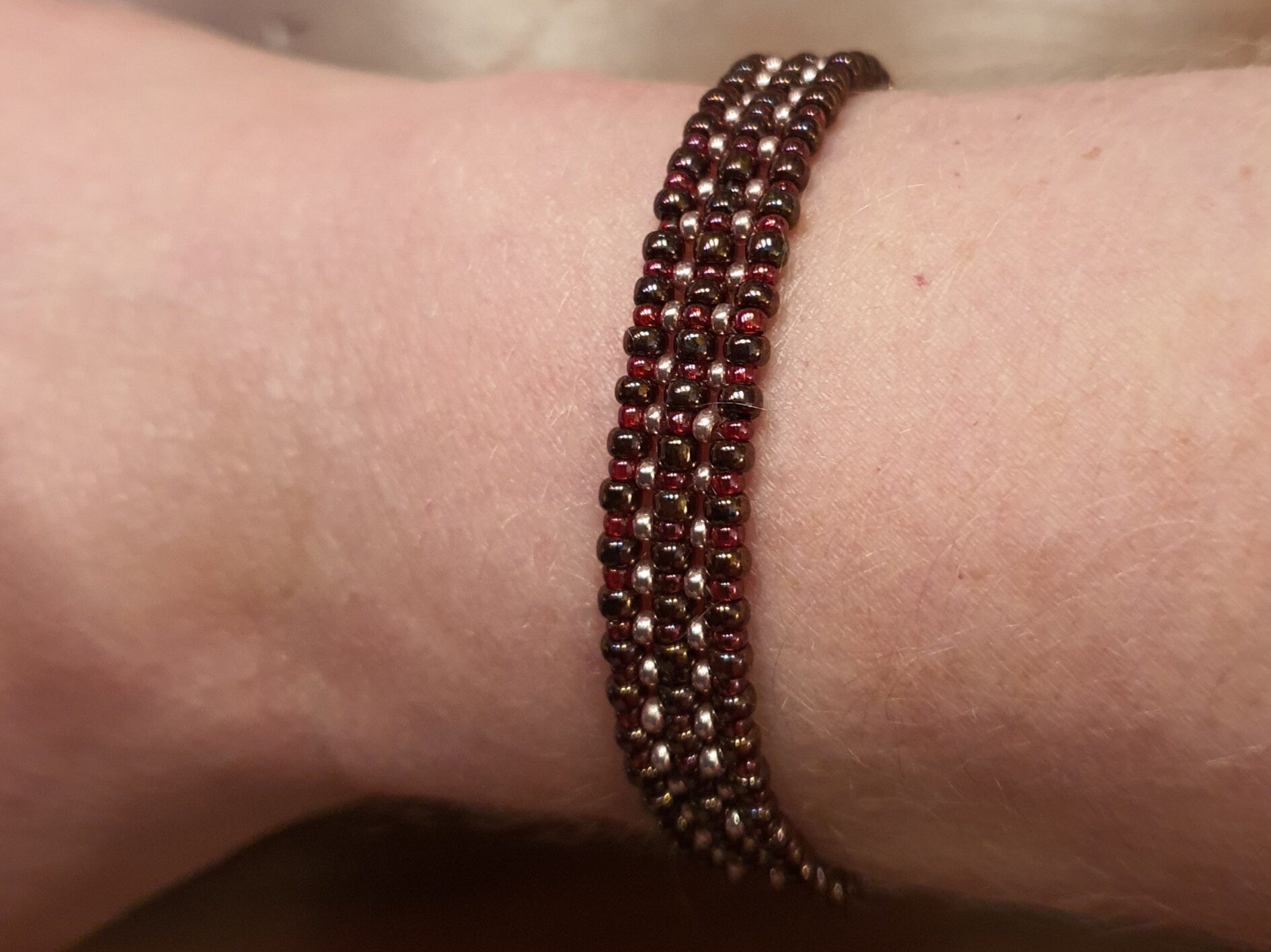 Deze armband is kraal voor kraal opgebouwd door met naald en speciaal draad de kralen aan elkaar te rijgen. Strak en simpel, waardoor deze elke dag draagbaar is en door het ontwerp prachtig te combineren met de ketting Sealed with a Kiss. Een handgemaakte, chique armband.