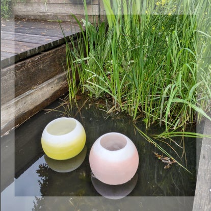 Met behulp van mal en het recyclede en gezuiverde kaarsvet maken we een windlicht in een bolvorm. Door de vorm en het materiaal blijft de bol drijven in een vijver, zwembad of grote schaal met water. In de bol strooi je eerst een laagje (decor-) zand, voordat je er een (klein) waxinelichtje in zet. Hierdoor blijft het windlicht intact en licht de hele bol mooi op.